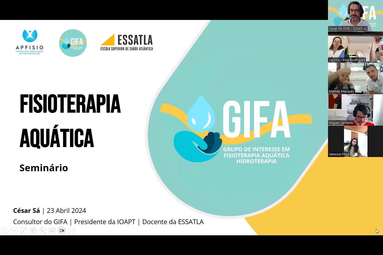 Estiveram presentes estudantes e Fisioterapeutas de todo o país, que enriqueceram os momentos de discussão. Como reflexão final, consideramos ser importante a inclusão da Fisioterapia Aquática nos Cuidados de Saúde Primários, através da criação de projetos com as Câmaras Municipais.